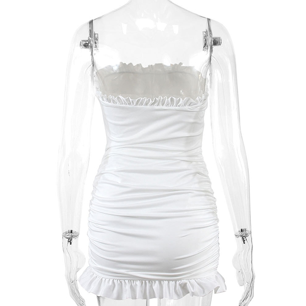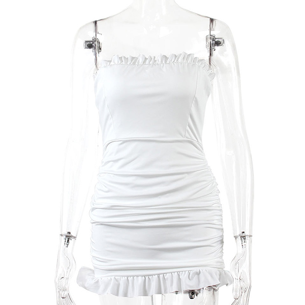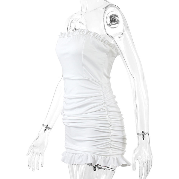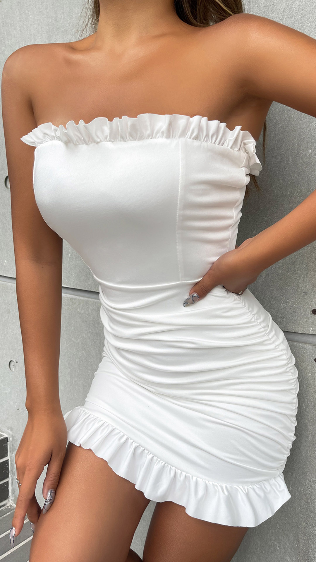 This party dress is sure to turn heads! It features a ruffled strapless bodice with a sexy bodycon fit. The skirt is short and flirty, perfect for dancing the night away.