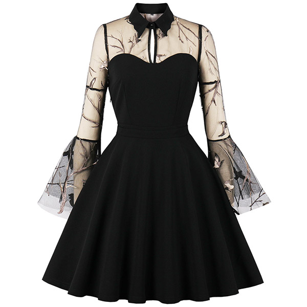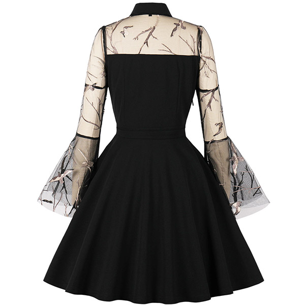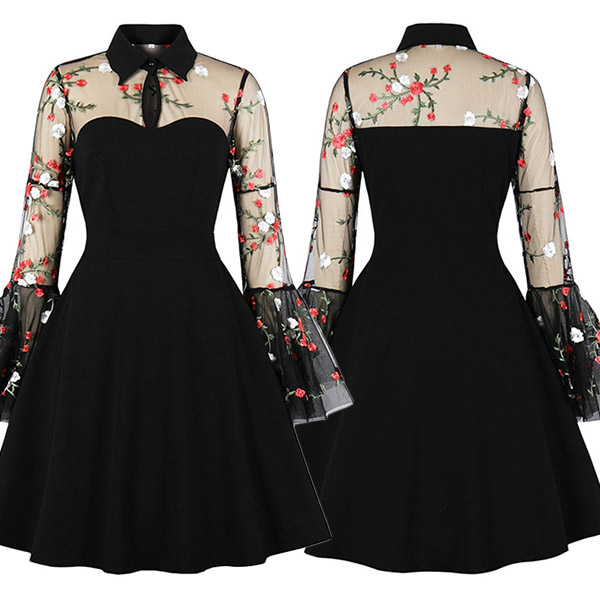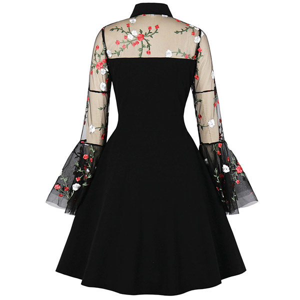 You are sure to be pleasant sight to draw more attention when you dress yourself up with this dress. The see-through gauze spliced details,trumpet sleeve and embroidery details make this piece look so alluring,distinctive and charming. No matter for your daytime out to night dating,this dress can easily strike your mind.