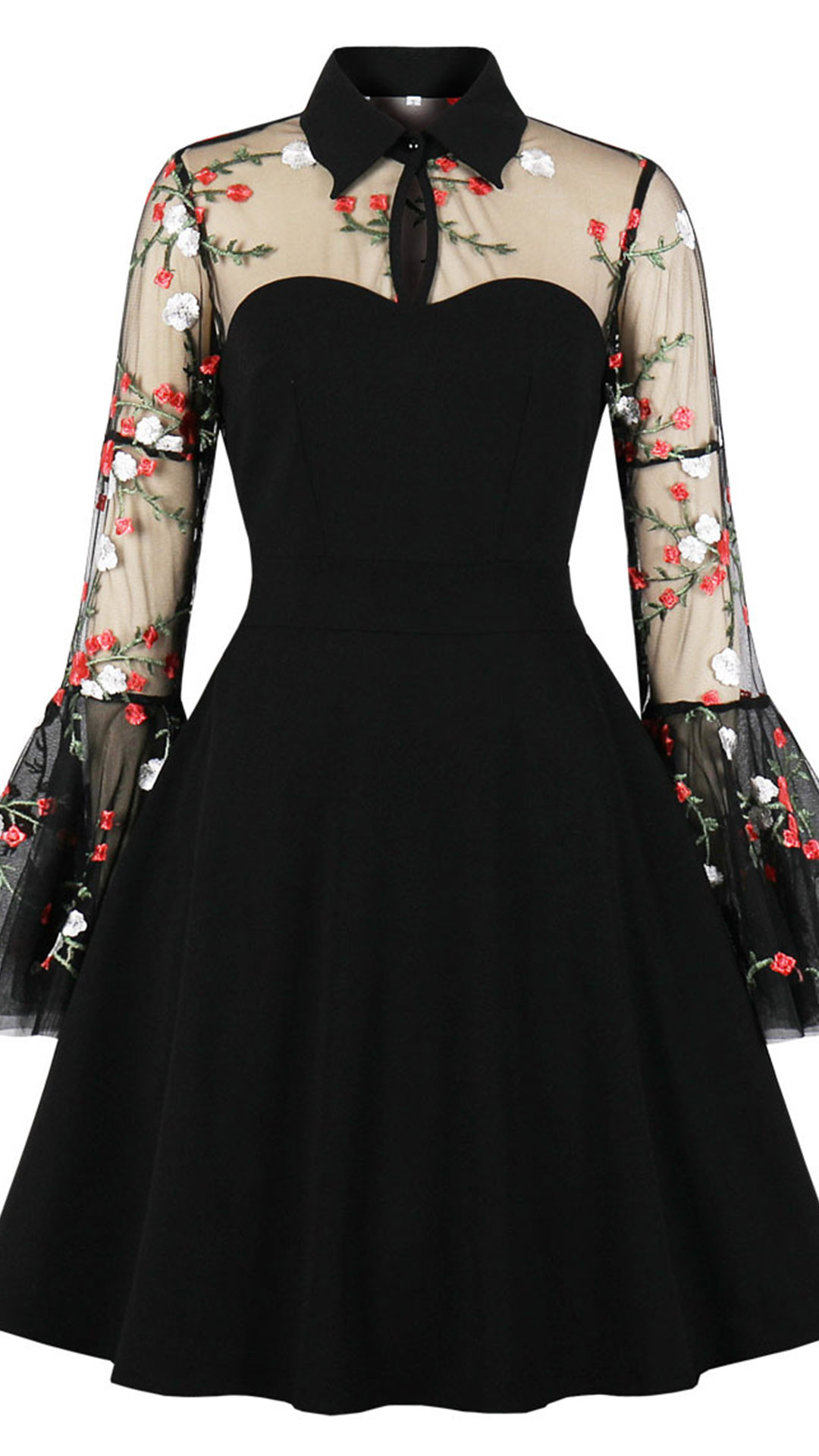 Sexy See-throigh Gauze Spliced Trumpet Sleeve POLO Collar Embroidery Dress