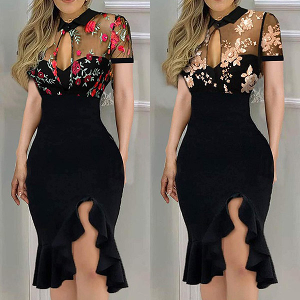 Sexy See-through Gauze Embroidery Slit Ruffle Hem Slim Fit Party Dress