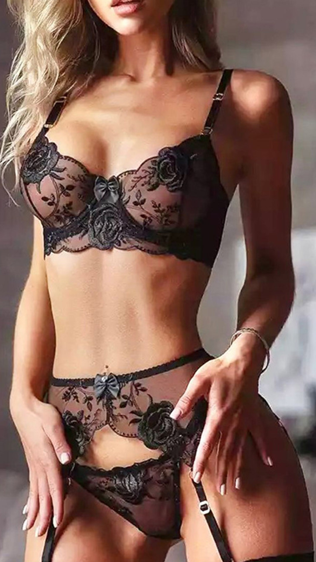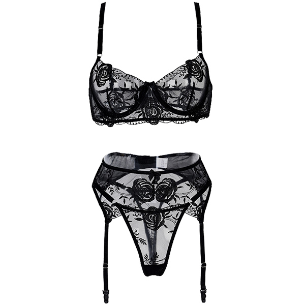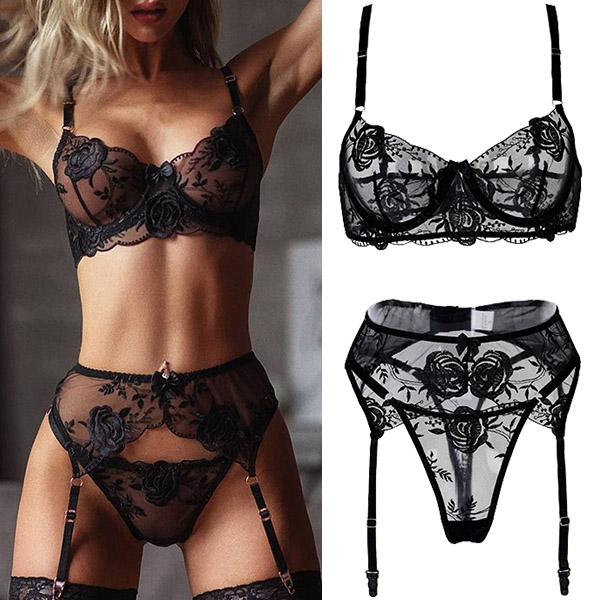 Inject a splash of sexy and flirty vibes into your wardrobe with this lingerie set. With flattering black tones, transparent gauze and floral embroidery details, this lingerie set would radiate your femininity. So why not save this set for your lingerie parties and honeymoon trips?