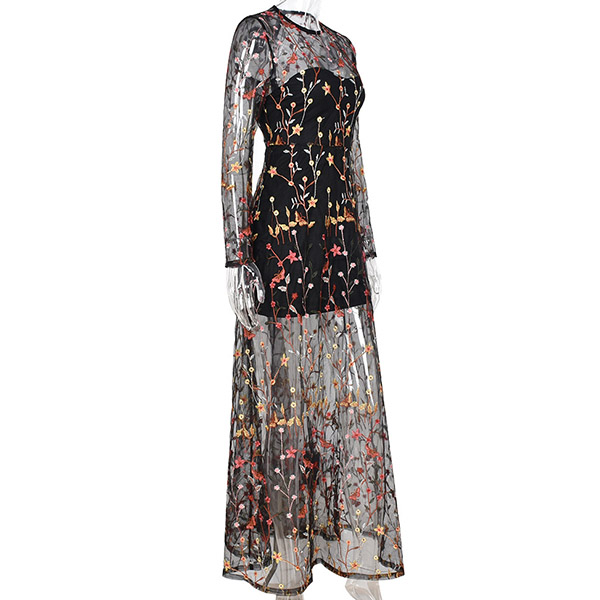 Sexy See-through Gauze Long Sleeve Embroidery Dress + Sling Dress Two-piece Set