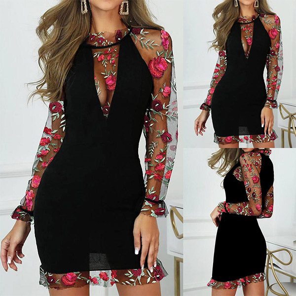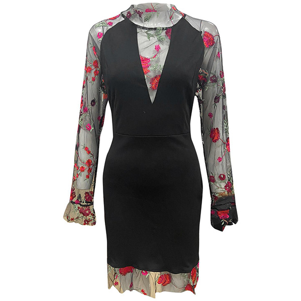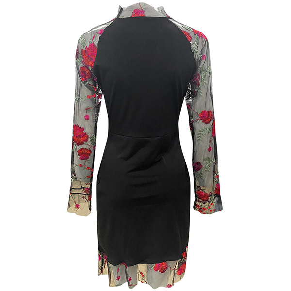 Sexy See-through Gauze Rose Embroidery Spliced Long Sleeve Slim Fit Dress