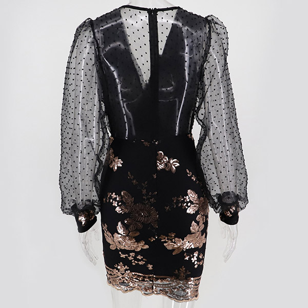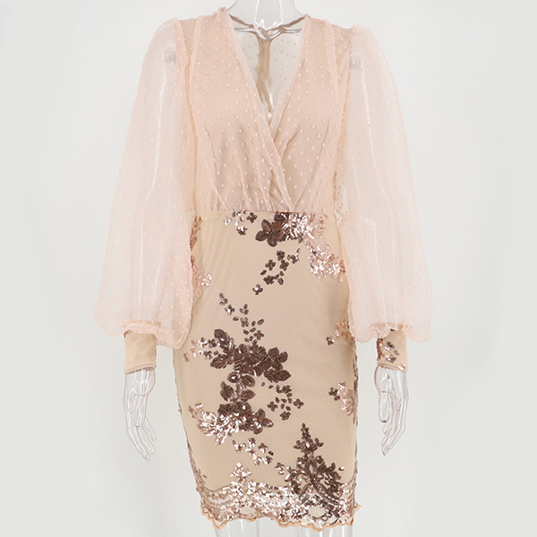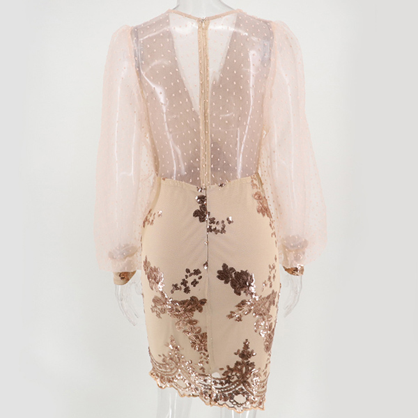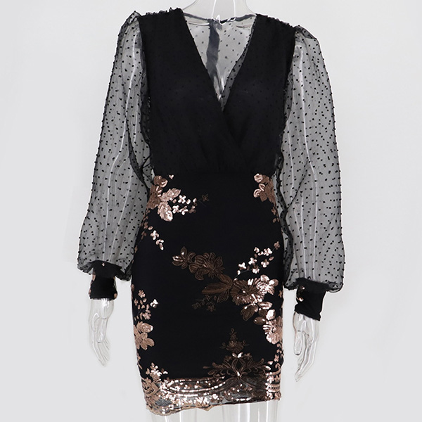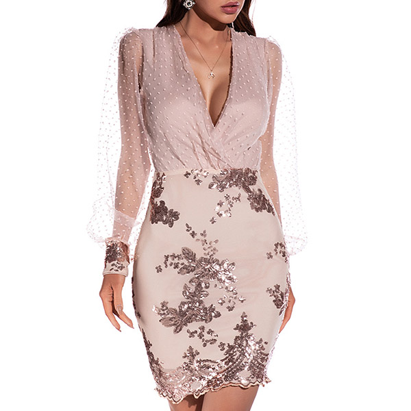 Sexy See-through Gauze Sequin Spliced Long Sleeve V-neck Slim Fit Dress