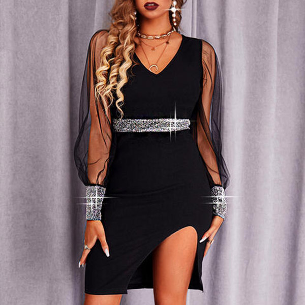 Sexy See-through Gauze Spliced Lantern Sleeve V-neck Slit Hem SLim Fit Party Dress