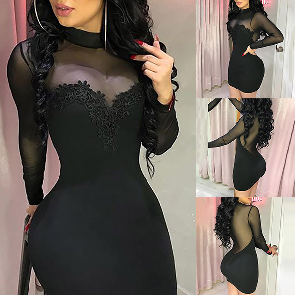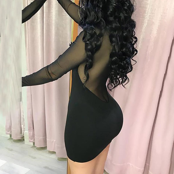 Sexy See-through Gauze Spliced Long Sleeve Mock Neck Slim Fit Tight Dress