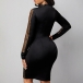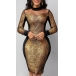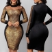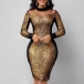 Sexy See-through Gauze Spliced Long Sleeve Round Neck Contrast Color Gold Dress