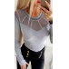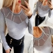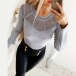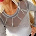 Sexy See-through Gauze Spliced Long Sleeve Round Neck Rhinestone T-shirt