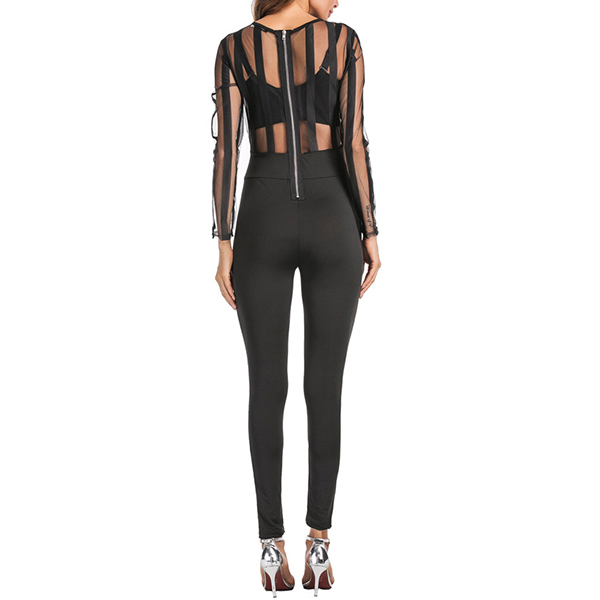 Wow,you look so sexy and alluring in this jumpsuit! See-through gauze spliced style,designed with long sleeve,round neck,