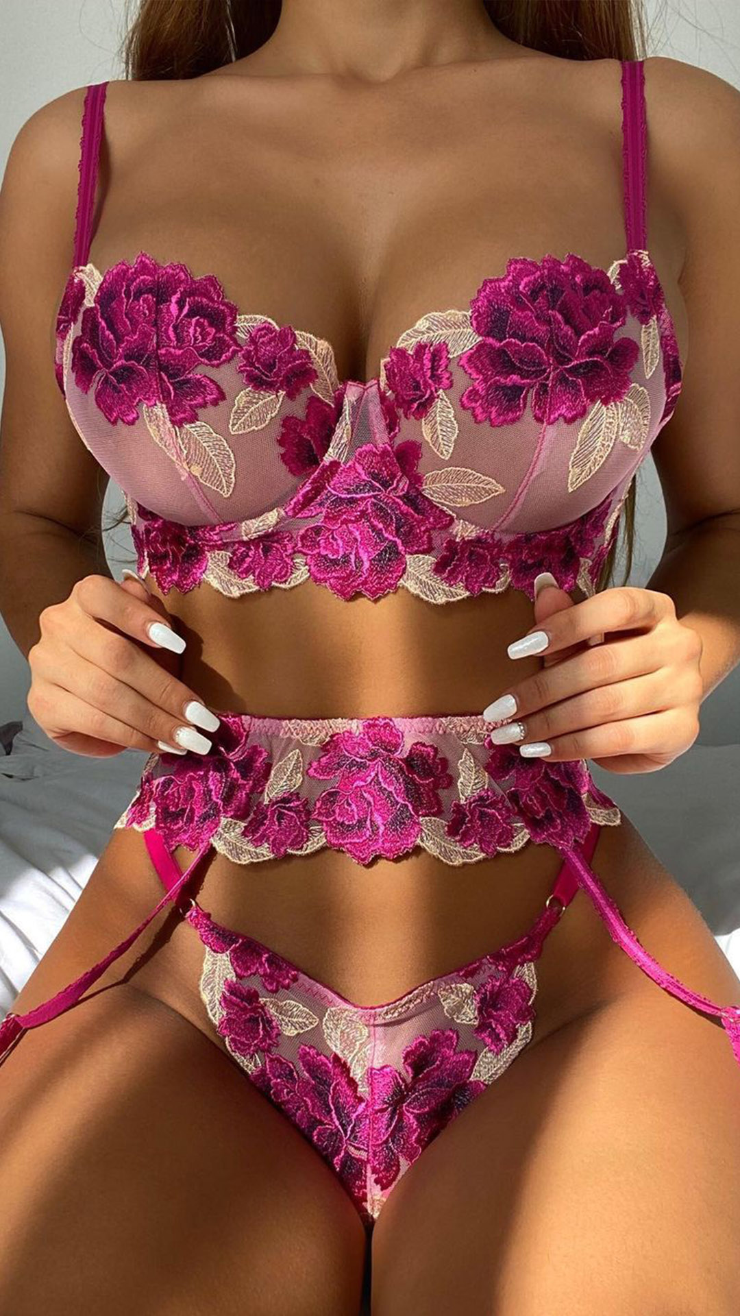 This lingerie set features the see-through gauze spliced and noble peony embroidery details,,which is the perfect weapon to shape your seductive curve. Meanwhile,its soft and breathable fabric can ensure the comfy. For the lingerie parties,hot nights and honeymoon trips,this three-piece set can be your perfect choice.