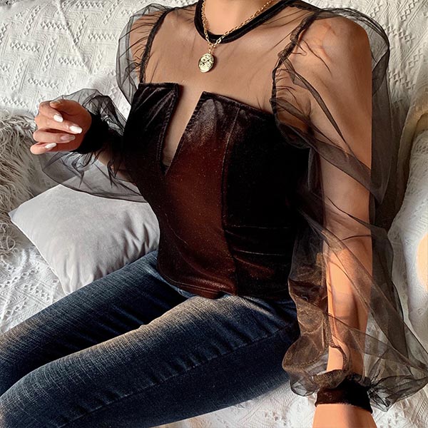 Add a dash of sexy and flirty vibes to your wardrobe with this top! The see-through gauze spliced design makes this piece look so alluring,and the puff sleeve design can further enhance its charm. When you wanna update your style,you can have a try this piece.