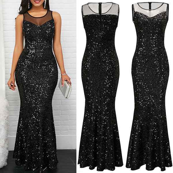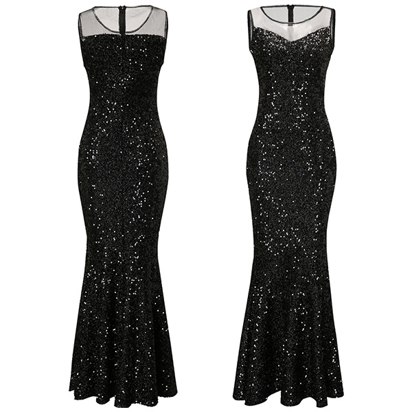 You can easily be the focus when you are invited to a party or gathering in this stunning sequin dress. The see-through gauze spliced details will enhance its flirty sense. Finished with sleeveless,round neck and a fit silhouette,this dress is a good weapon to portray your beautiful side.