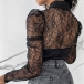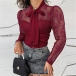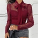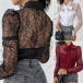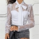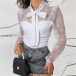 Sexy See-through Lace Spliced Long Sleeve Lace-up Bow-know Collar Blouse Shirt