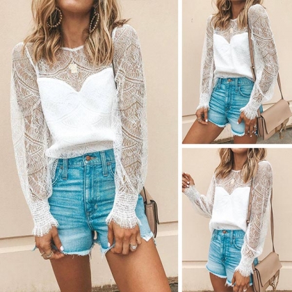 Attracted by this sexy and stylish top? Then add it to your wardrobe! The see-through lace spliced details make this piece look so sexy and flirty. Finished with long sleeve,round neck and a loose silhouette,this top can create a sassy look by teaming with a printed skirt.