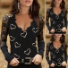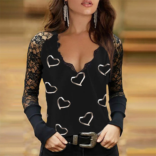 Sexy See-through Lace Spliced Long Sleeve V-neck Heart Printed T-shirt