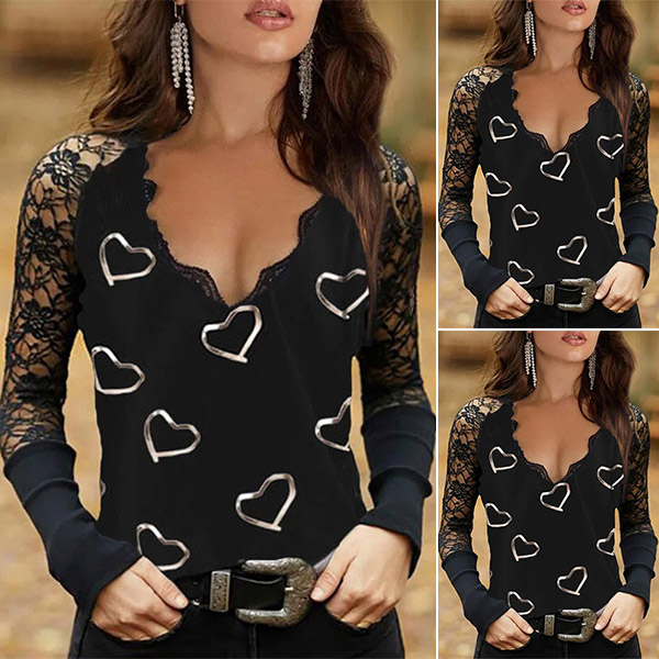 Only need one glance,you would be attracted by this sexy and flirty t-shirt. The see-through lace spliced long sleeve and v-neck design can enhance its entire charm,while the heart pattern design will lend you some sweet vibes. Like it? Then invite this piece to your wardrobe!