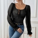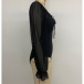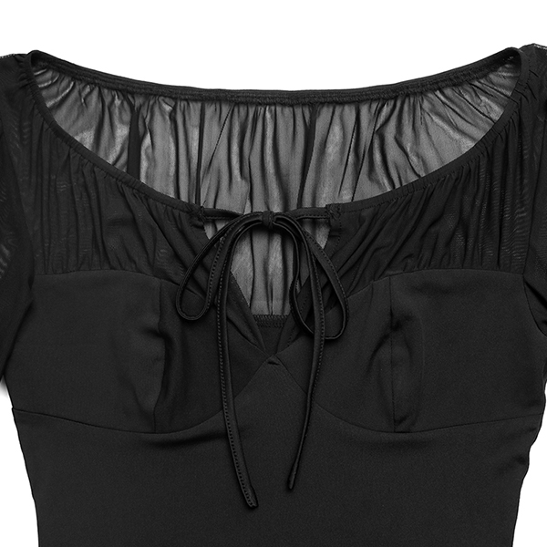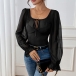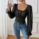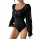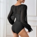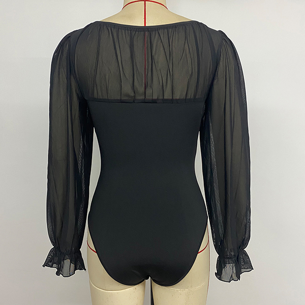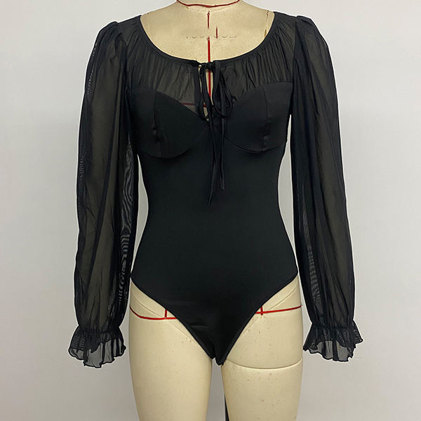 Sexy Self-tie Square Neck Front Cutout Gauze Spliced Long Sleeve Black Bodysuit