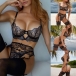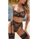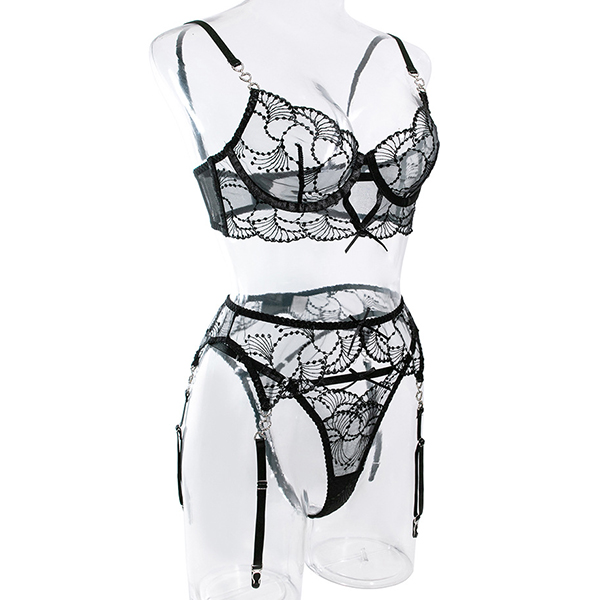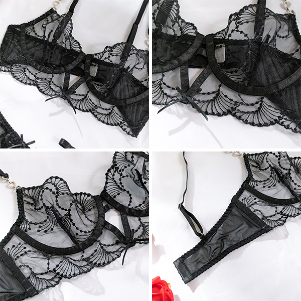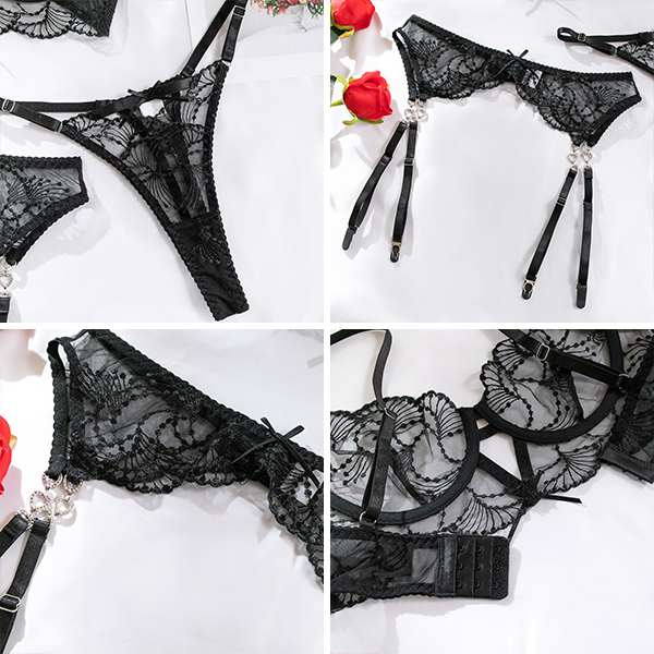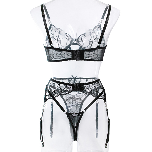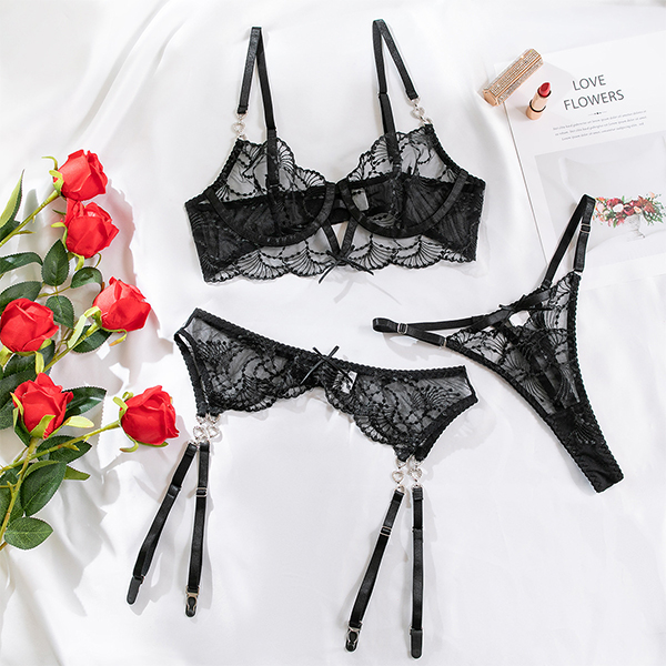 Sexy Semi-through Cut Out Floral Embroidery Lace Three-piece Lingerie Set