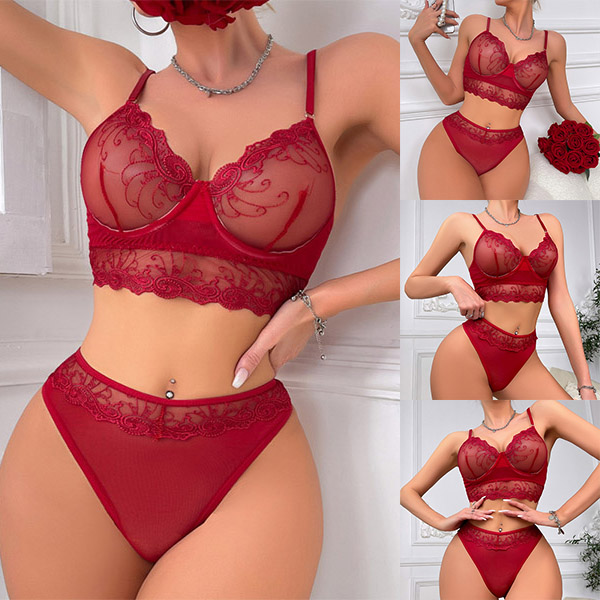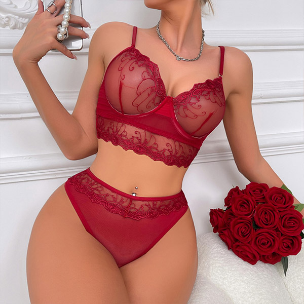 Sexy Semi-through Floral Embroidered Two-piece Lingerie Set