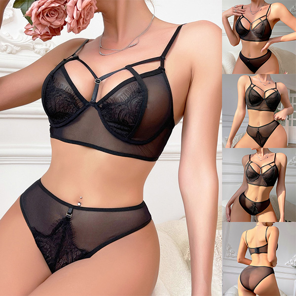 Sexy Semi-through Gauz Spliced Lace Cutout Two-piece Lingerie Set