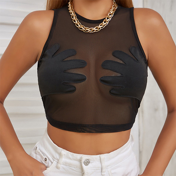 Sexy Semi-through Gauze Hand Pattern Round Neck Sleeveless Crop Top