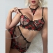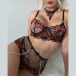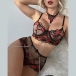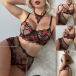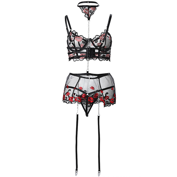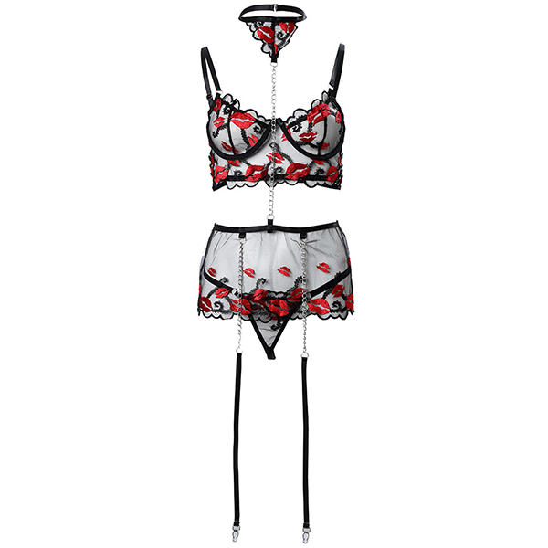 Sexy Semi-through Gauze Lip Emboridery Three-piece Lingerie Set