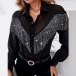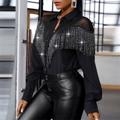 Sexy Semi-through Gauze Spliced Bling-bling Tassle Long Sleeve Blouse