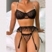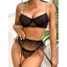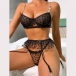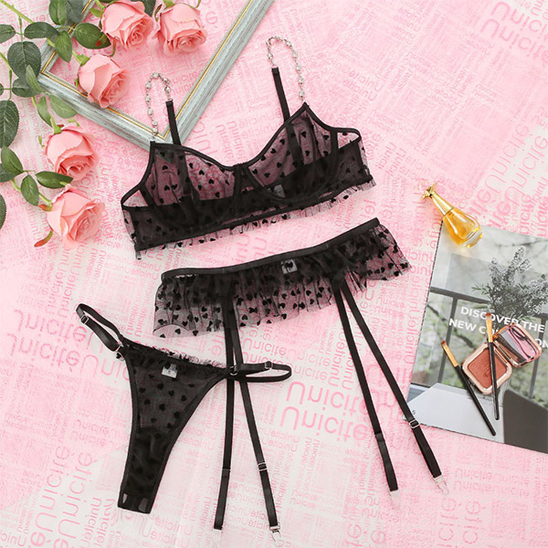 Sexy Semi-through Gauze Spliced Heart Printed Rhinestone Chain Three-piece Lingerie Set