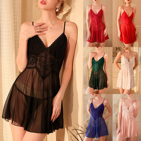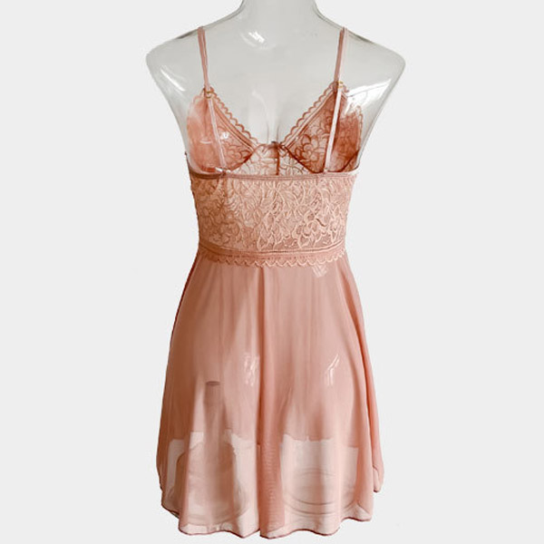 Sexy Semi-through Gauze Spliced Lace V-neck Slip Nightwear Dress