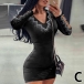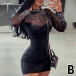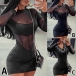 Sexy Semi-through Gauze Spliced Rhinestone Mock Neck Long Sleeve Bodycon Dress