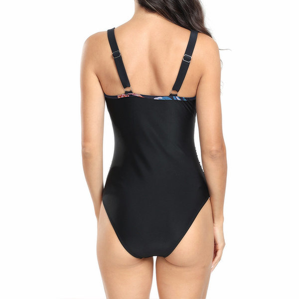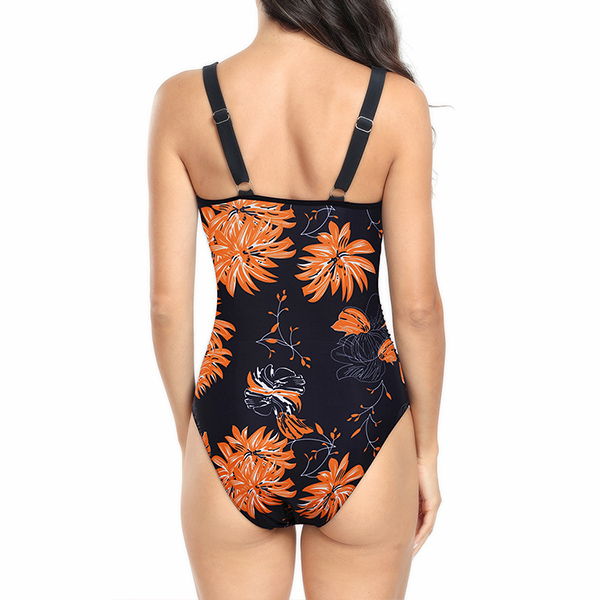 Sexy Semi-through Gauze Spliced V-neck Backless Floral Printed Swimming Monokini