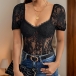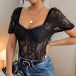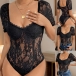 Sexy Semi-through Lace Spliced Gauze Round Neck Cap Sleeve Lingerie Bodysuit with Underwire