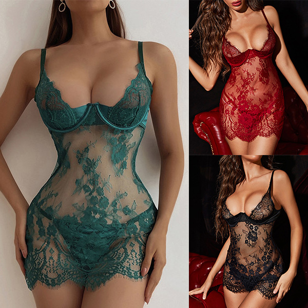 Sexy Semi-through Lace Spliced Push-up Nightwear Dress Set
