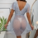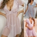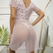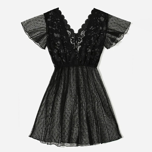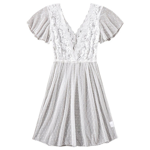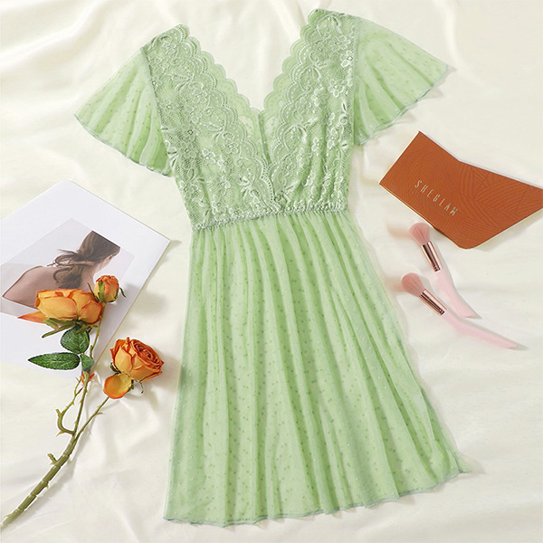 Sexy Semi-through Lace Spliced Swiss-dot V-neck Short Sleeve Nightwear Dress