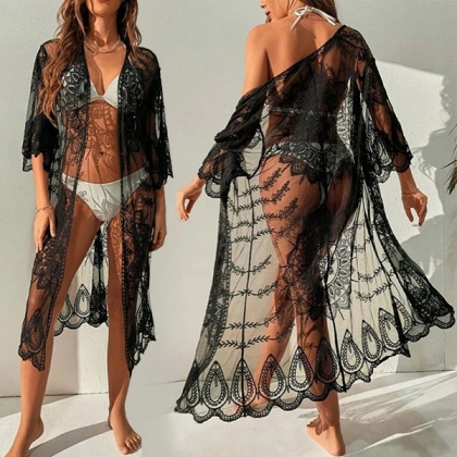 Sexy Semi-through Lace Swimming Cover-up Cardigan
