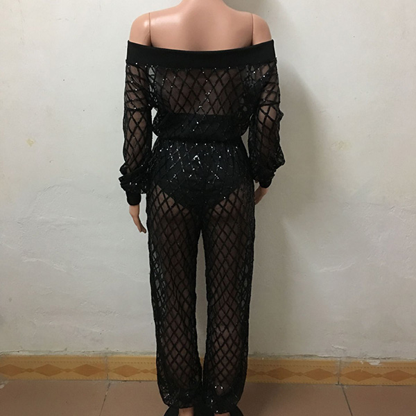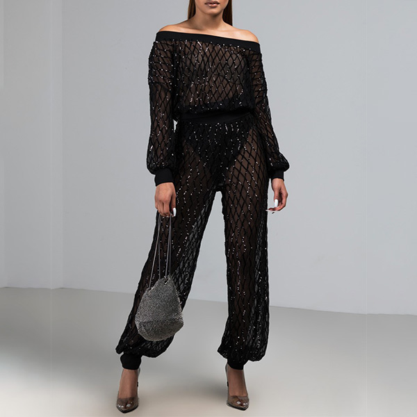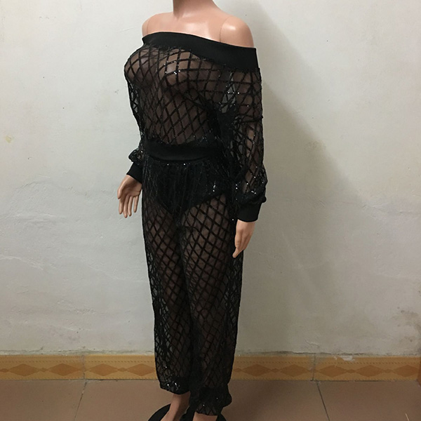 Sexy Semi-through Net Two-piece Set Consist of Off-the-shoudler Top and Pants
