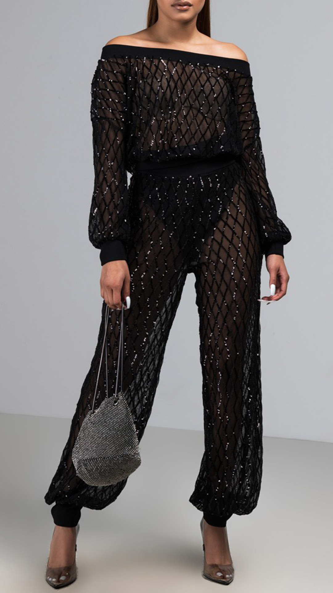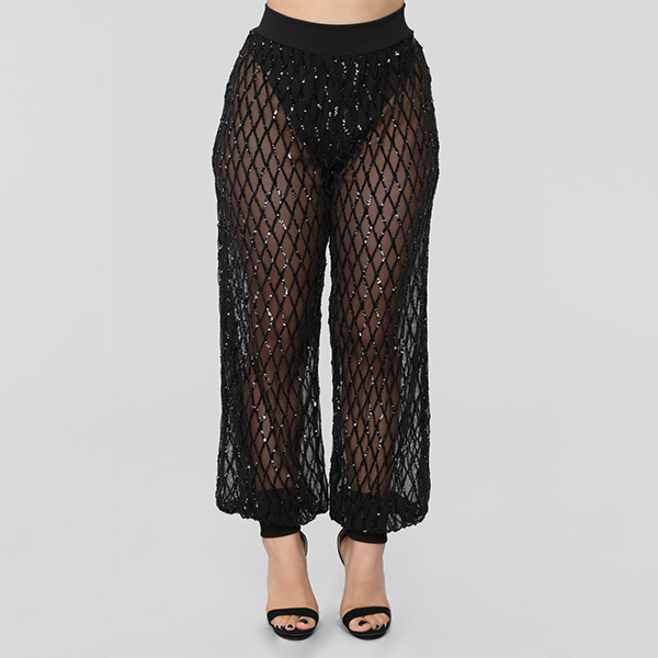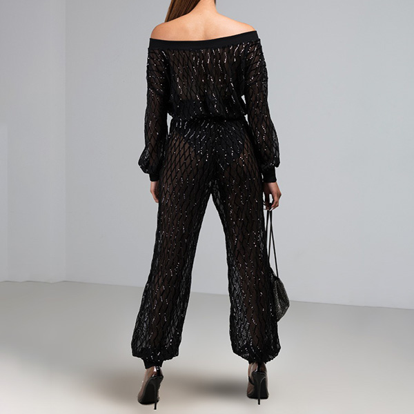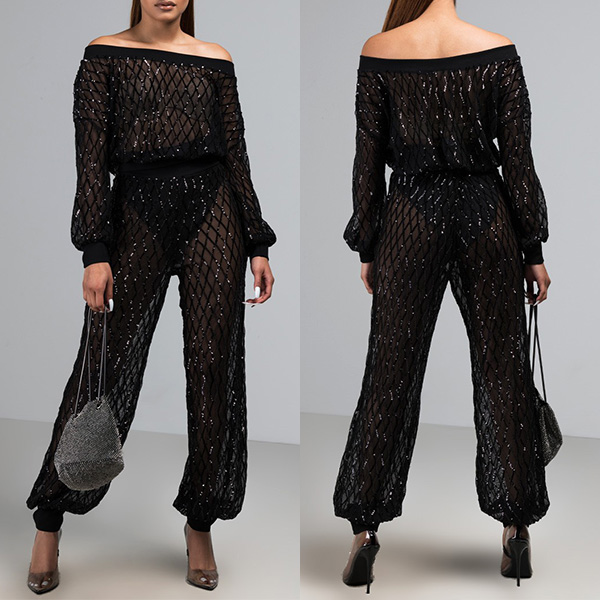 This sexy semi-through two-piece set is perfect for a night out or in. The top featuring lantern long sleeve, off-the-shoudler design, and the pant has a elastic waistline and hem.