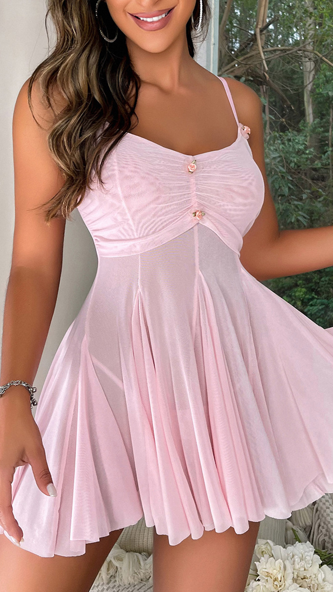 Sexy Semi-through Ruched Buttoned Pleated Nightwear Dress