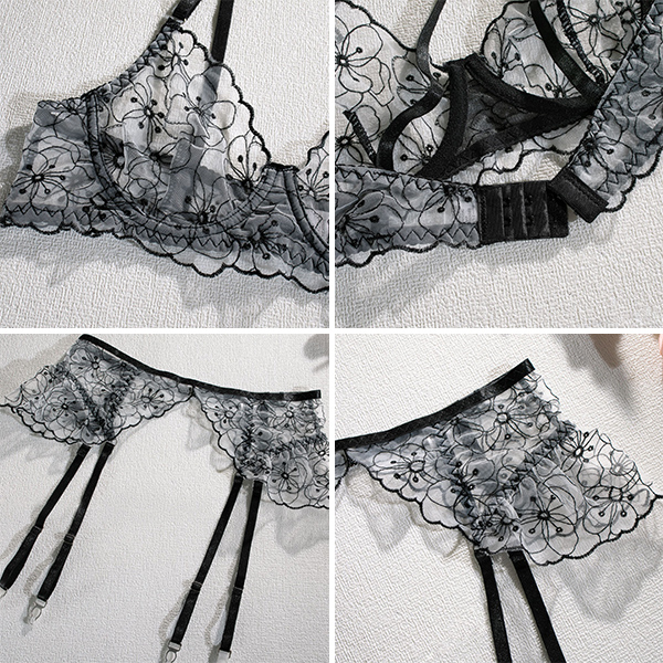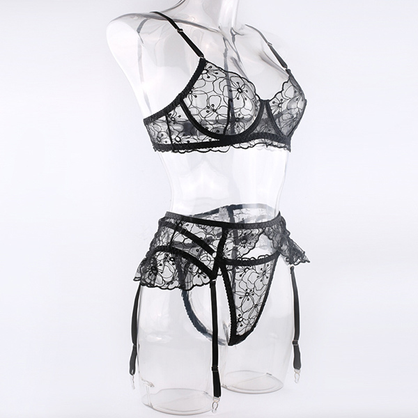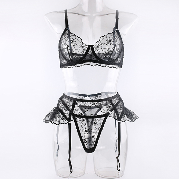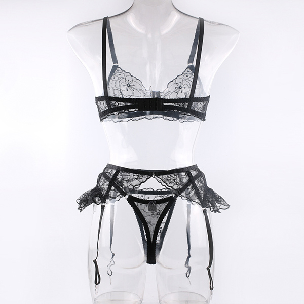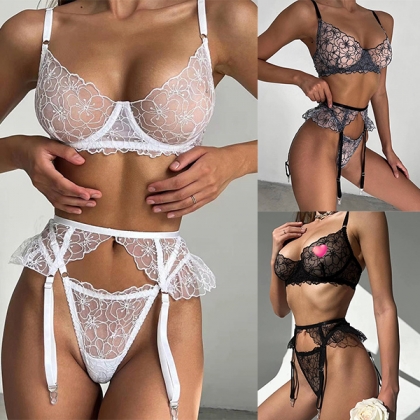 Sexy Semi-through Ruffled Lace Three-piece Lingerie Set