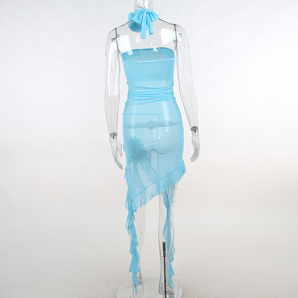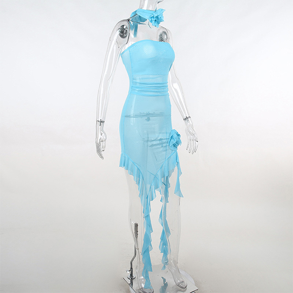 How about this party dress? The strapless design adds a touch of sexiness to the dress, while the semi-through fabric creates a flirty and playful look. The irregular hemline adds a unique and edgy touch to the design. The 3D rose decoration on the dress creates a feminine and romantic vibe, making it perfect for a special occasion. The dress also comes with a matching 3D floral choker, adding a touch of elegance and completing the look. Wanna have a try?