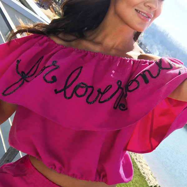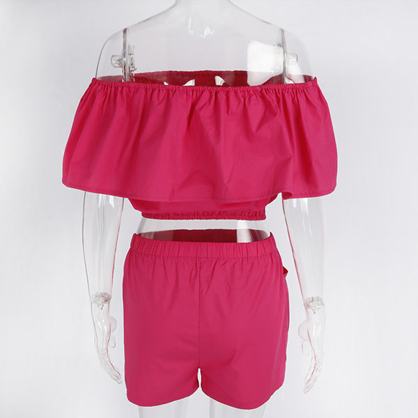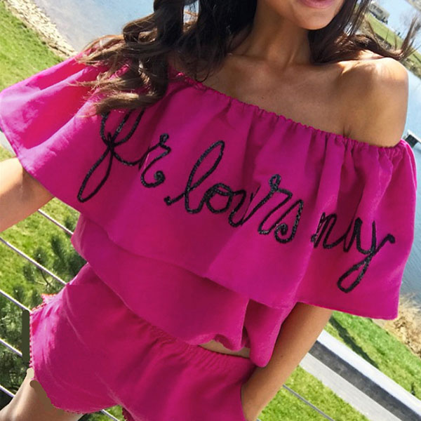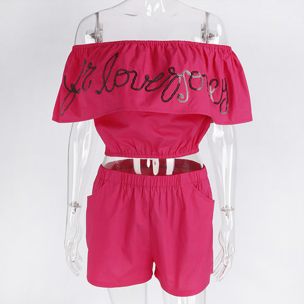 an off-shoulder ruffle crop top and a high waist shorts,decorated with sequin letters design makes it look more