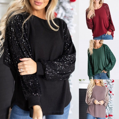 Sexy Sequin Spliced Lantern Sleeve Round Neck Loose Top