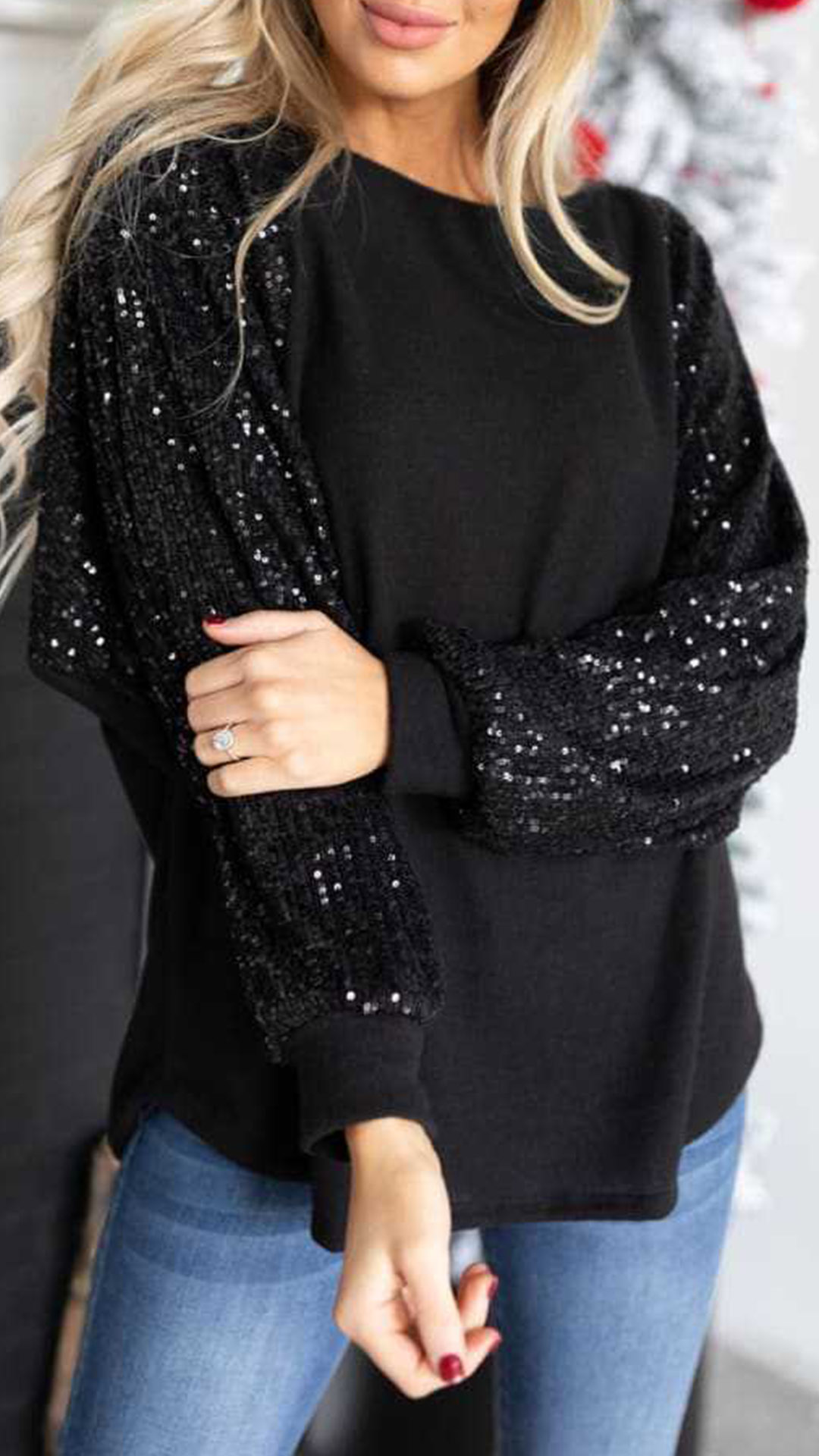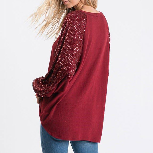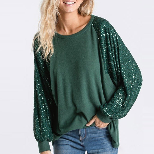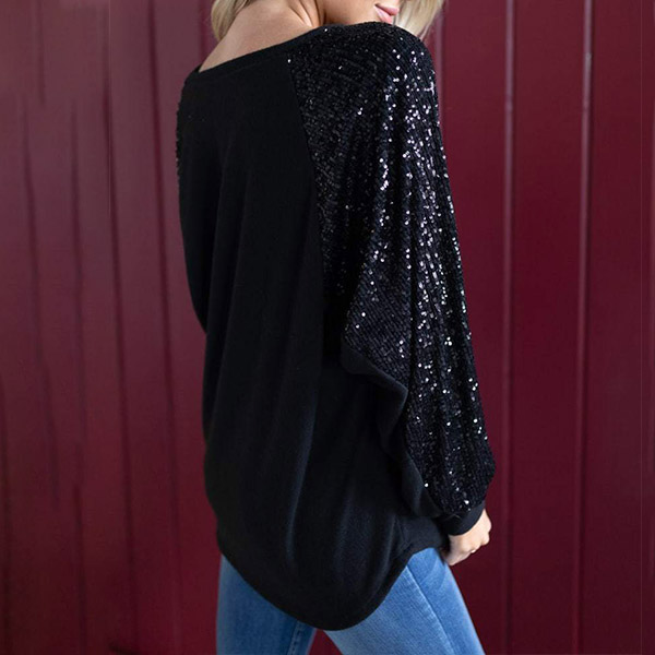 You can easily update your daily style and boost your charm with this wonderful top. The sequin spliced lantern sleeve design makes this piece look so distinctive and attractive,while its soft fabric and loose silhouette can ensure you a comfortable day. Perfect fit for matching with your tight pants.