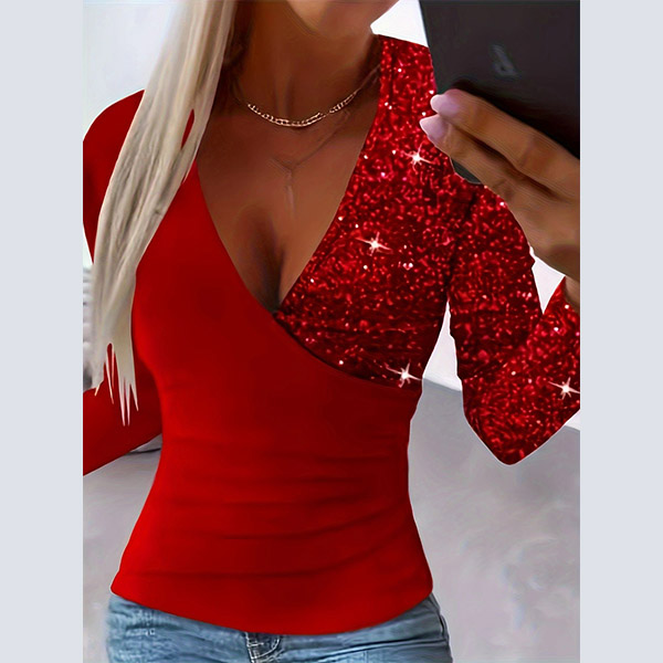 Look at this red shirt! The sequined spliced detailing adds a touch of allure and sophistication, creating a captivating and eye-catching look. Pair it with high-waisted pants or a skirt for a sleek and polished look.