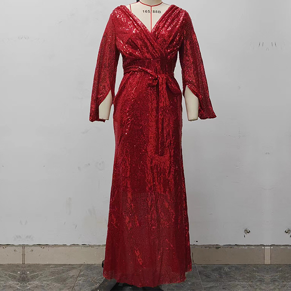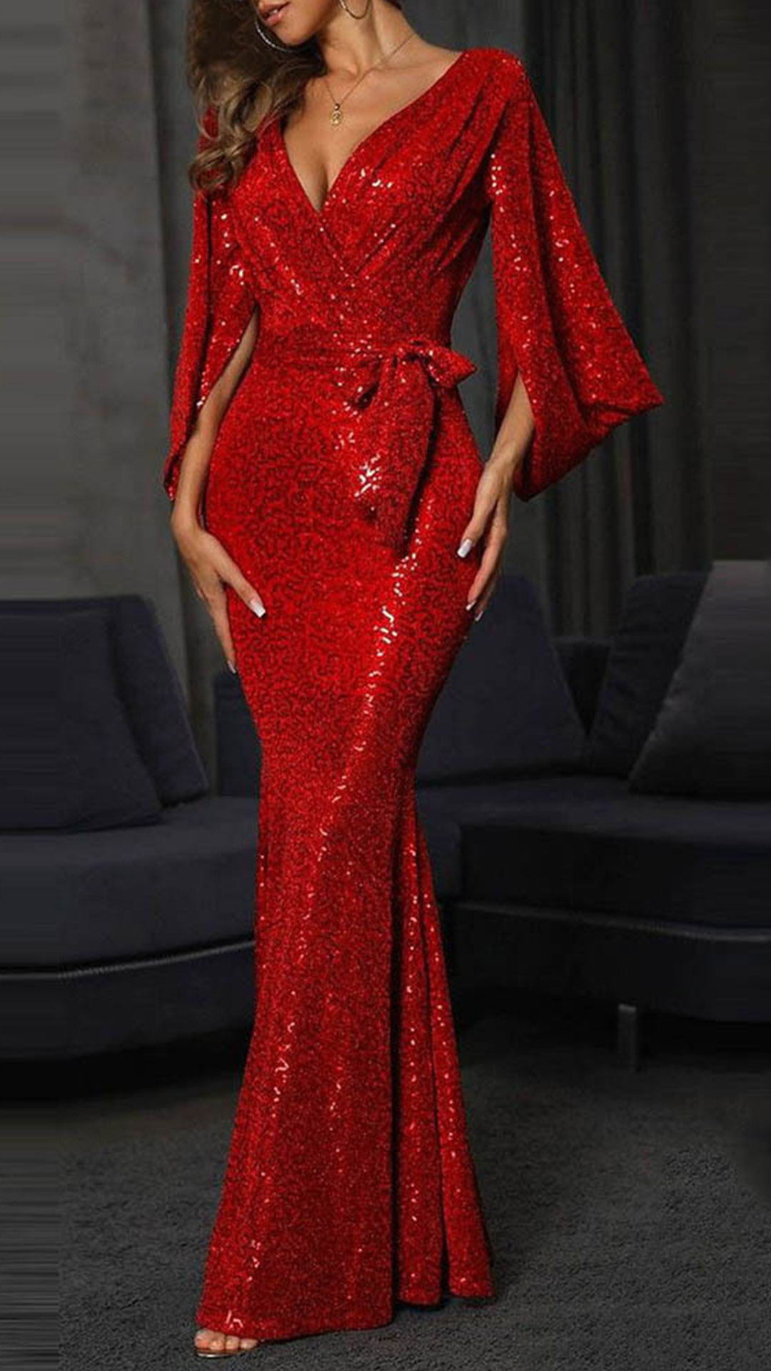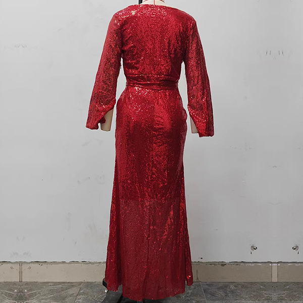 Sexy Sequined V-neck Elbow Sleeve Self-tie Fish-tail Party Dress
