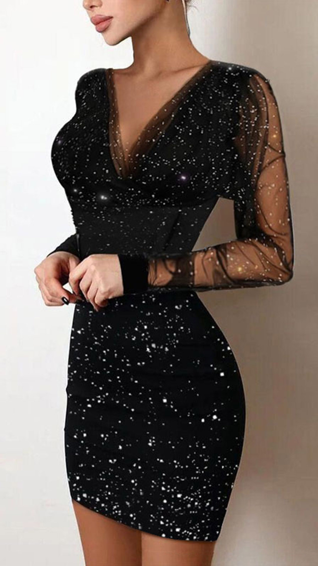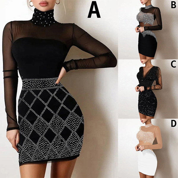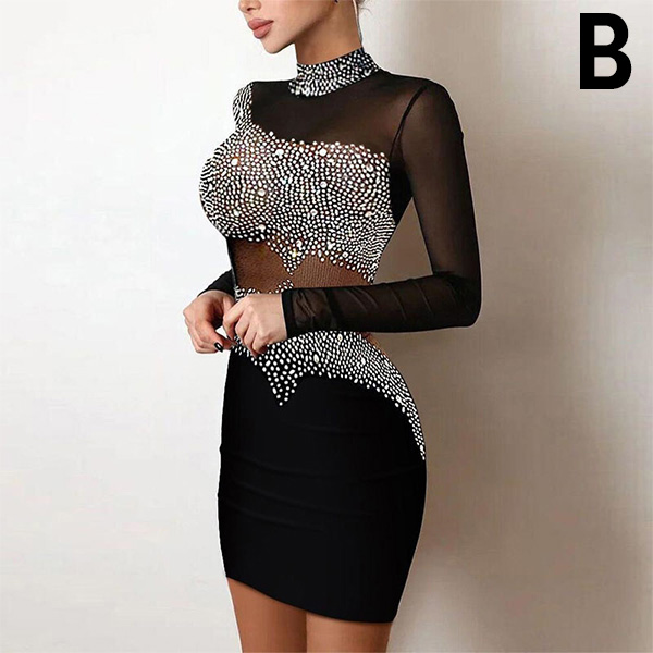 Sexy Sheer Gauze Rhinestone Spliced Long Sleeve Mock Neck Tight Dress