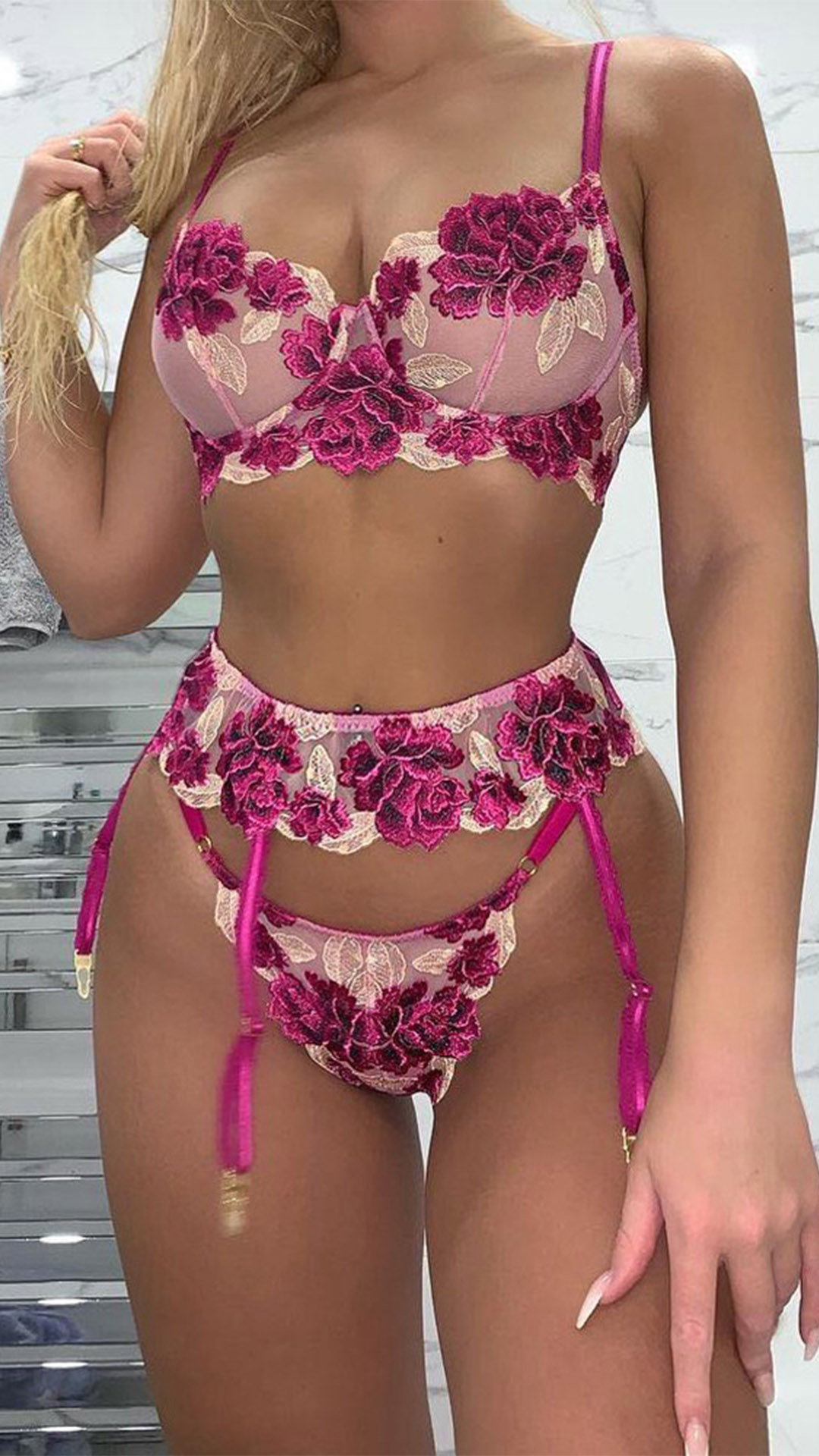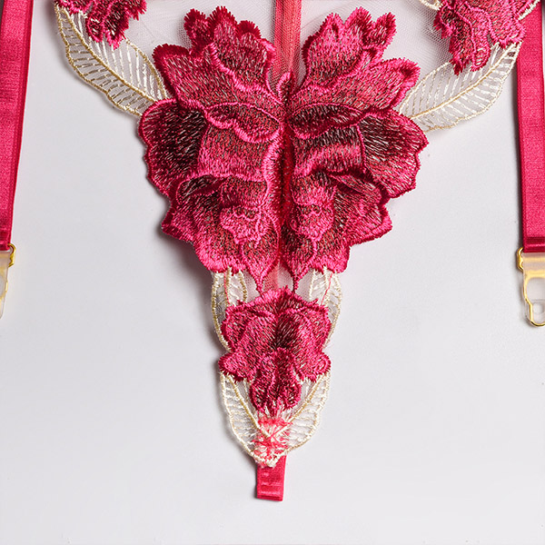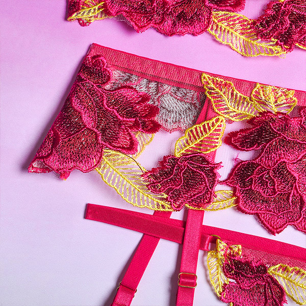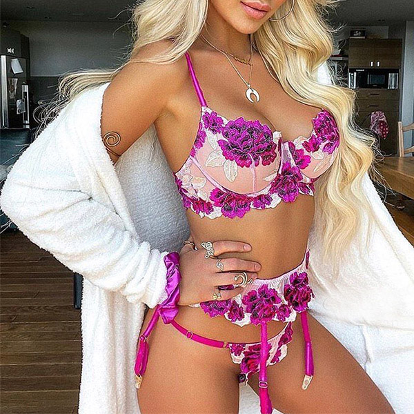 Combines of sheer gauze and rose embroidery details,this lingerie three-piece set can easily shape your seductive curve. And its soft,breathable fabric can give you an utmost comfort. For your hot nights,honeymoon trips and Valentine's Day and other romantic time,this lingerie set can be your perfect choice.