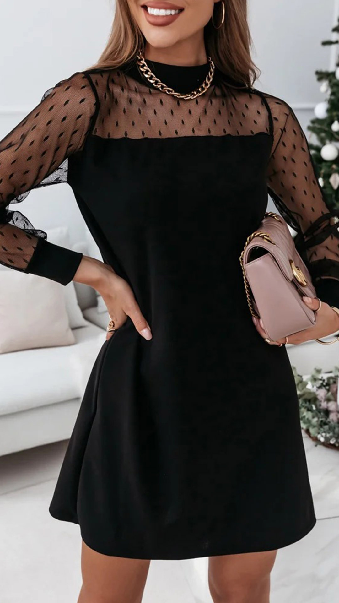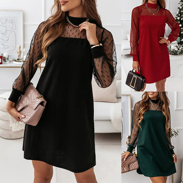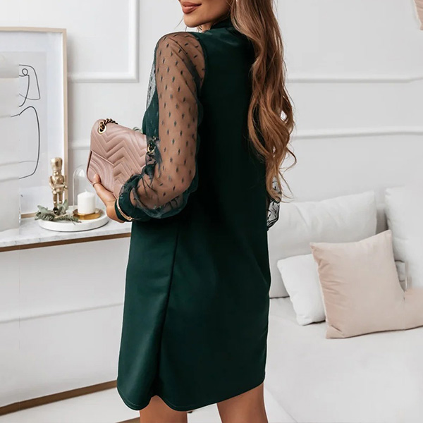 Sexy Sheer Gauze Spliced Long Sleeve Mock Neck Solid Color Dress
