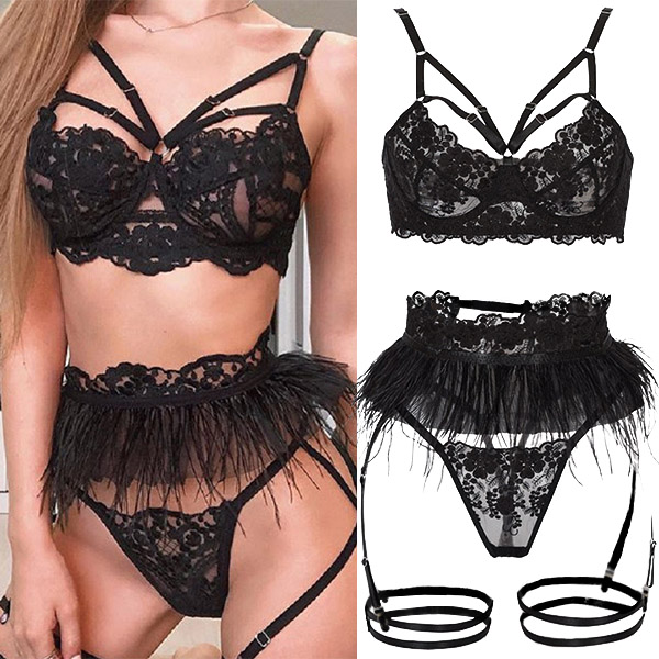 Combines of sheer lace and feather details,this lingerie set can offer your alluring and feminine side. Meanwhile,its soft and breathable fabric can give you a comfortable wearing feeling. When having a dating with your lover,you can choose this lingerie set to add some different flavor.
