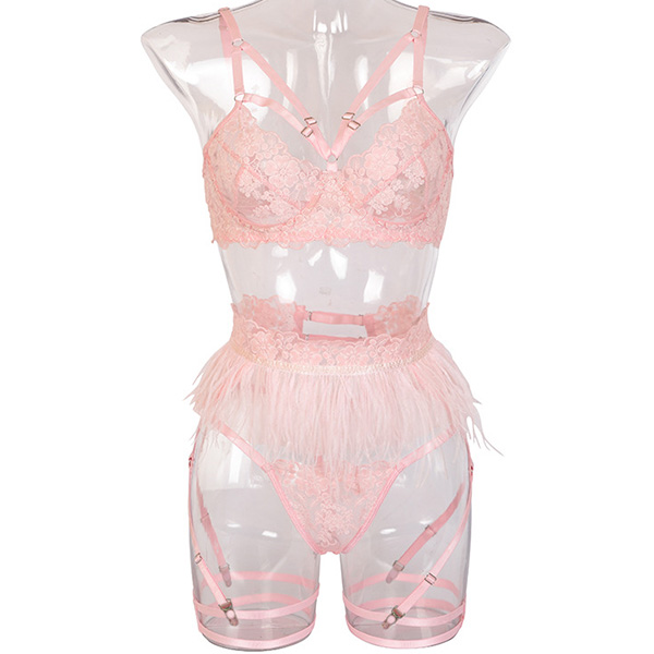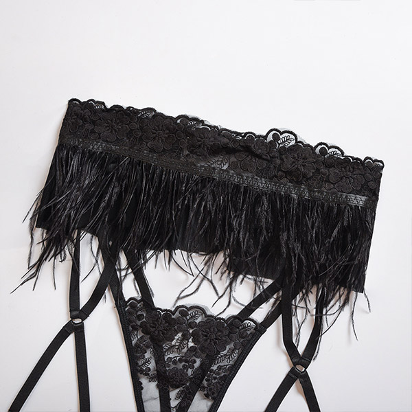 Sexy Sheer Lace Feather Spliced Lingerie Three-piece Set